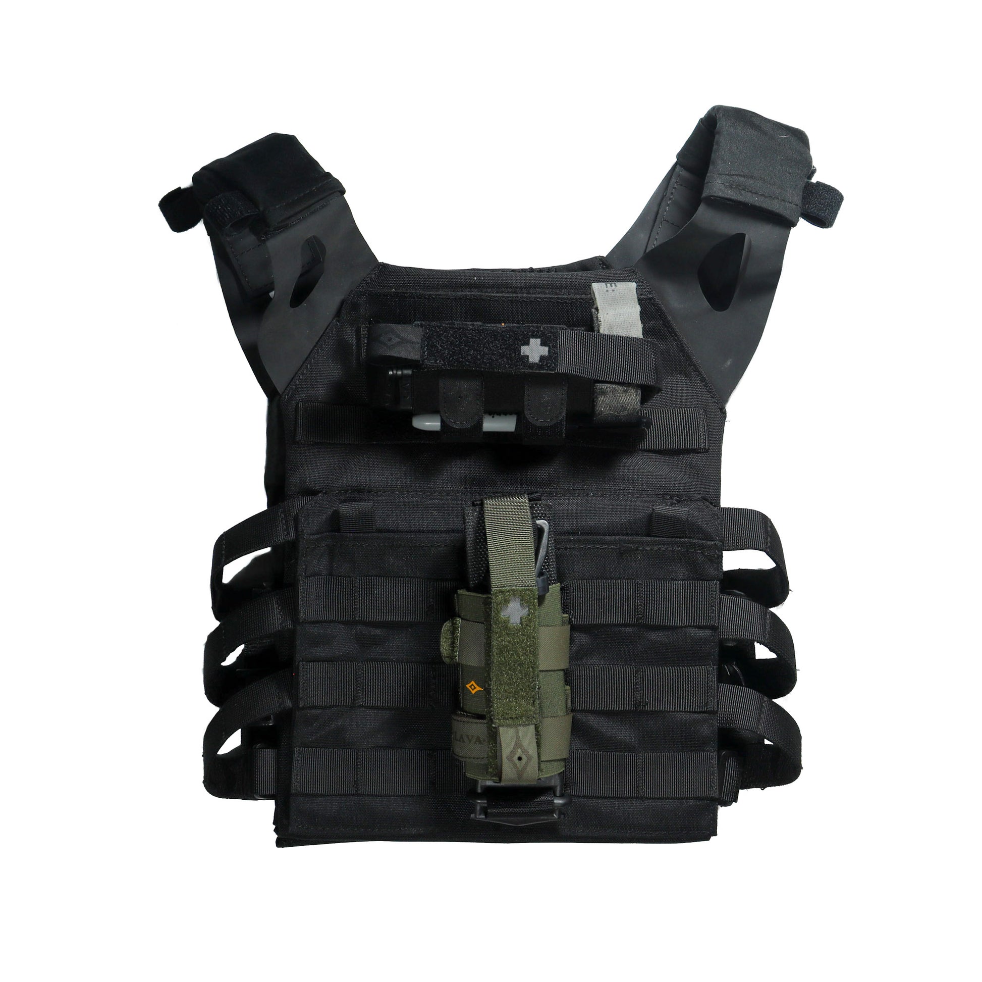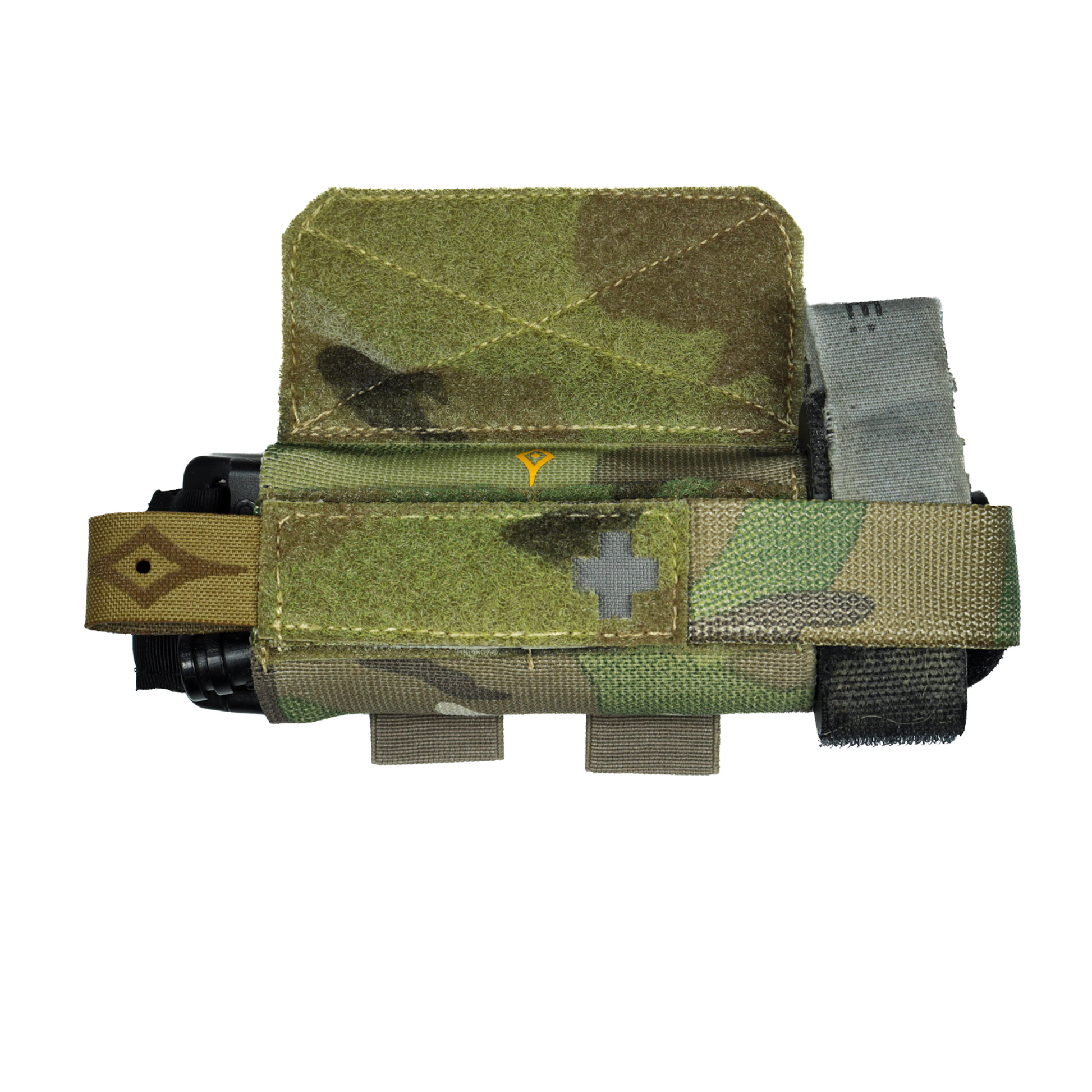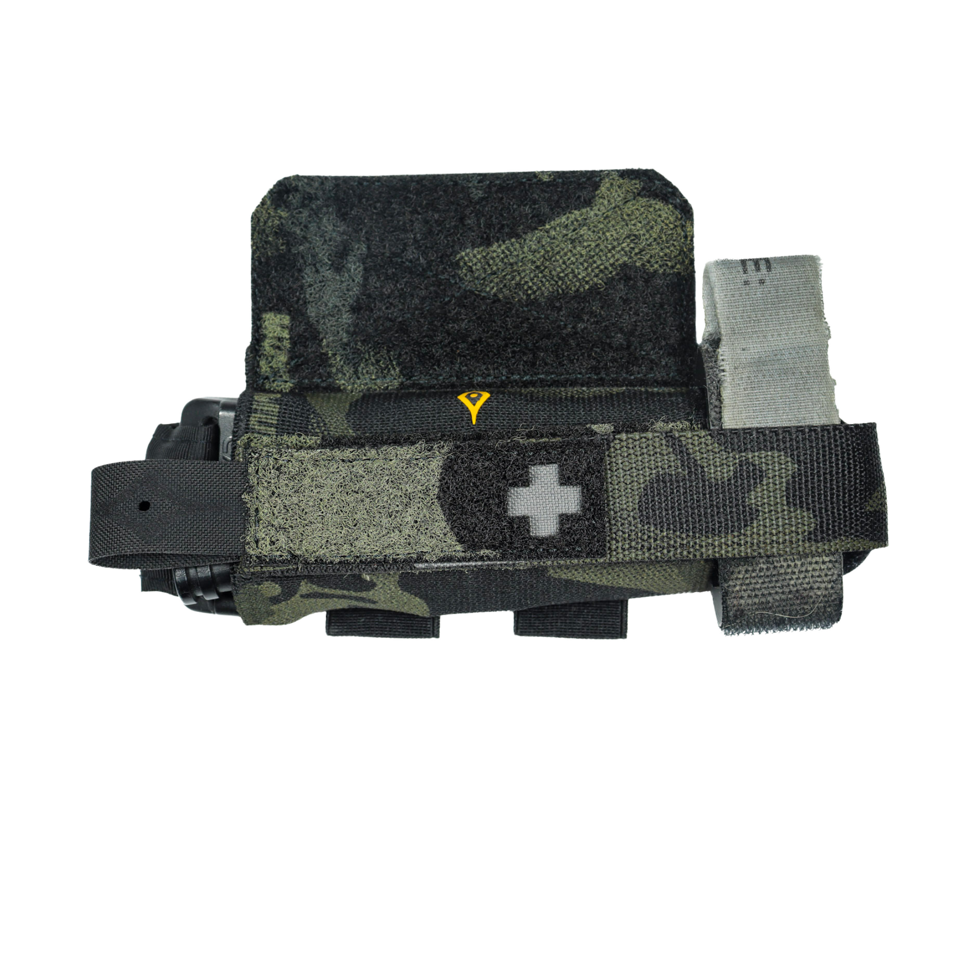 Con todo esto, conseguimos un porta torniquete que podremos colocar en cualquier línea de nuestro equipo y cambiar de posición rápidamente, sin renunciar a la seguridad y protección del torniquete. En su parte trasera, dos bucles elásticos permiten portar un rotulador, luces químicas o tijeras.